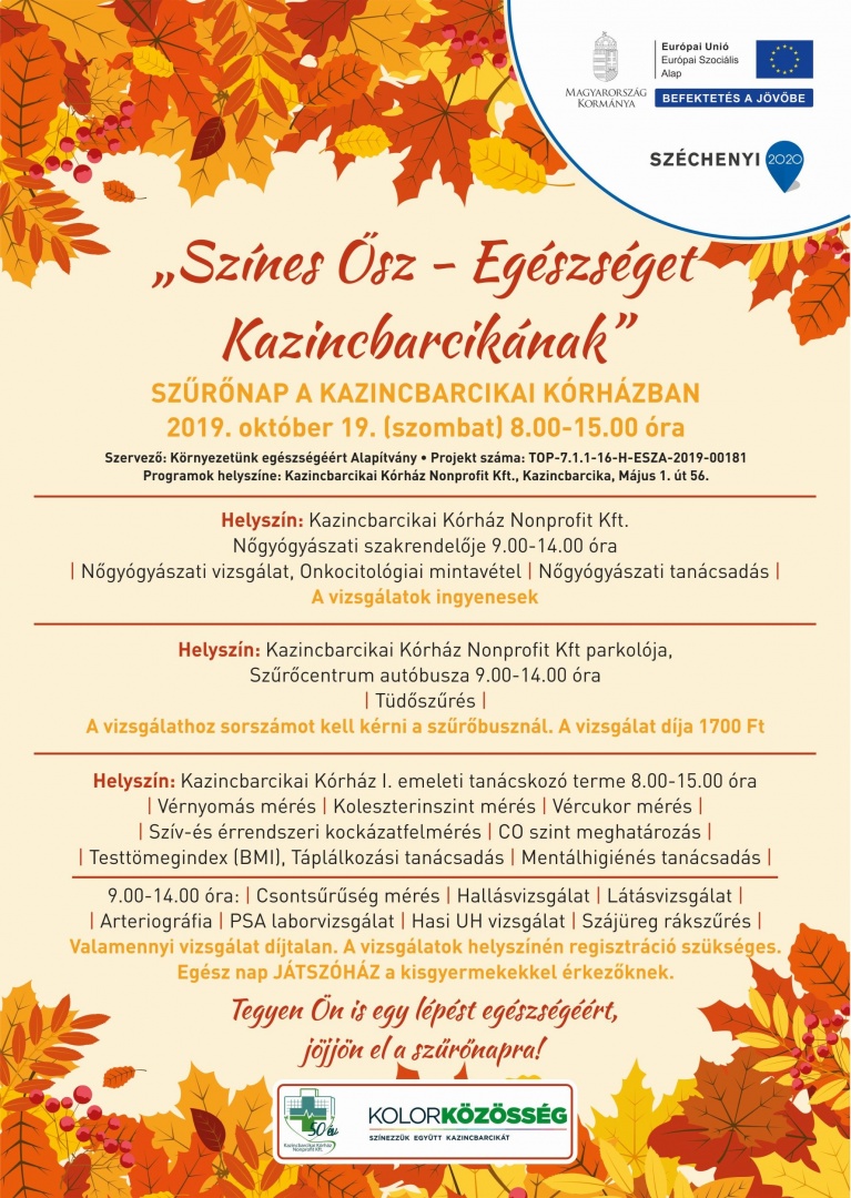 A “Környezetünk egészségéért Alapítvány” Színes Ősz-Egészséget Kazincbarcikának elnevezéssel szűrőnapot rendezett 2019. október 19-én. Az alapítván a TOP 7.1.1-16-H- ESZA-2019-00181 pályázat keretében nyert támogatást a szűrőnap megrendezéséhez.